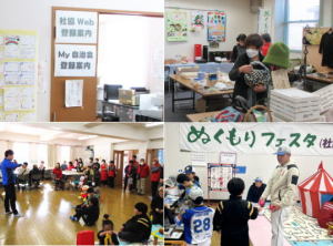 コミセンロビーでは能登支援即売会、地域活動紹介コーナー(つどい場ばんぶー、子ども食堂”おむすび)、スマホ困りごと相談が開設された。市社協担当の能登支援の物産は初めての物品販売で賑わっていた。